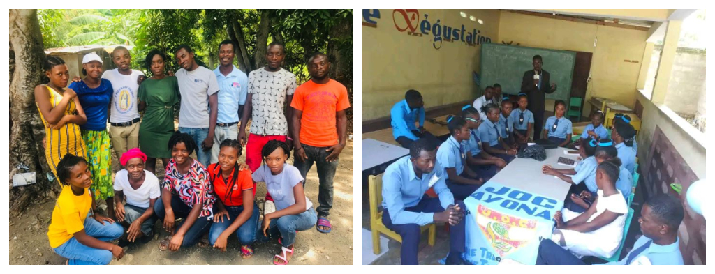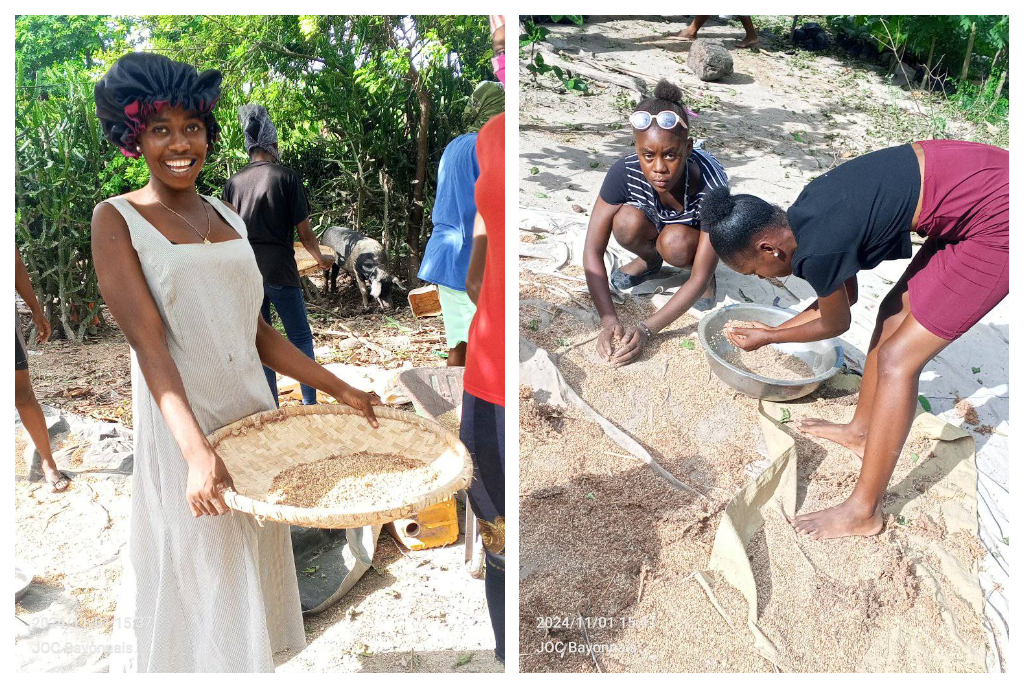 Ante esta situación, el grupo base de la JOC Bayonnais decidió cultivar maíz y guandul, un cultivo esencial y muy adecuado para las condiciones climáticas de la región. El maíz es muy consumido por las familias locales en diversas formas (papilla, galletas, tostado, etc.) y se puede vender fácilmente en el mercado local. No requiere técnicas agrícolas complejas, lo que permite a los jóvenes iniciarse rápidamente en su cultivo. La idea surgió a partir de un debate sobre la necesidad de producir localmente lo que se consume, al tiempo que se refuerza la solidaridad y la responsabilidad de los miembros del grupo. Un miembro voluntario cedió un terreno y los jóvenes decidieron juntos organizar un huerto colectivo de maíz, símbolo de acción concreta y de toma de las riendas de su futuro.